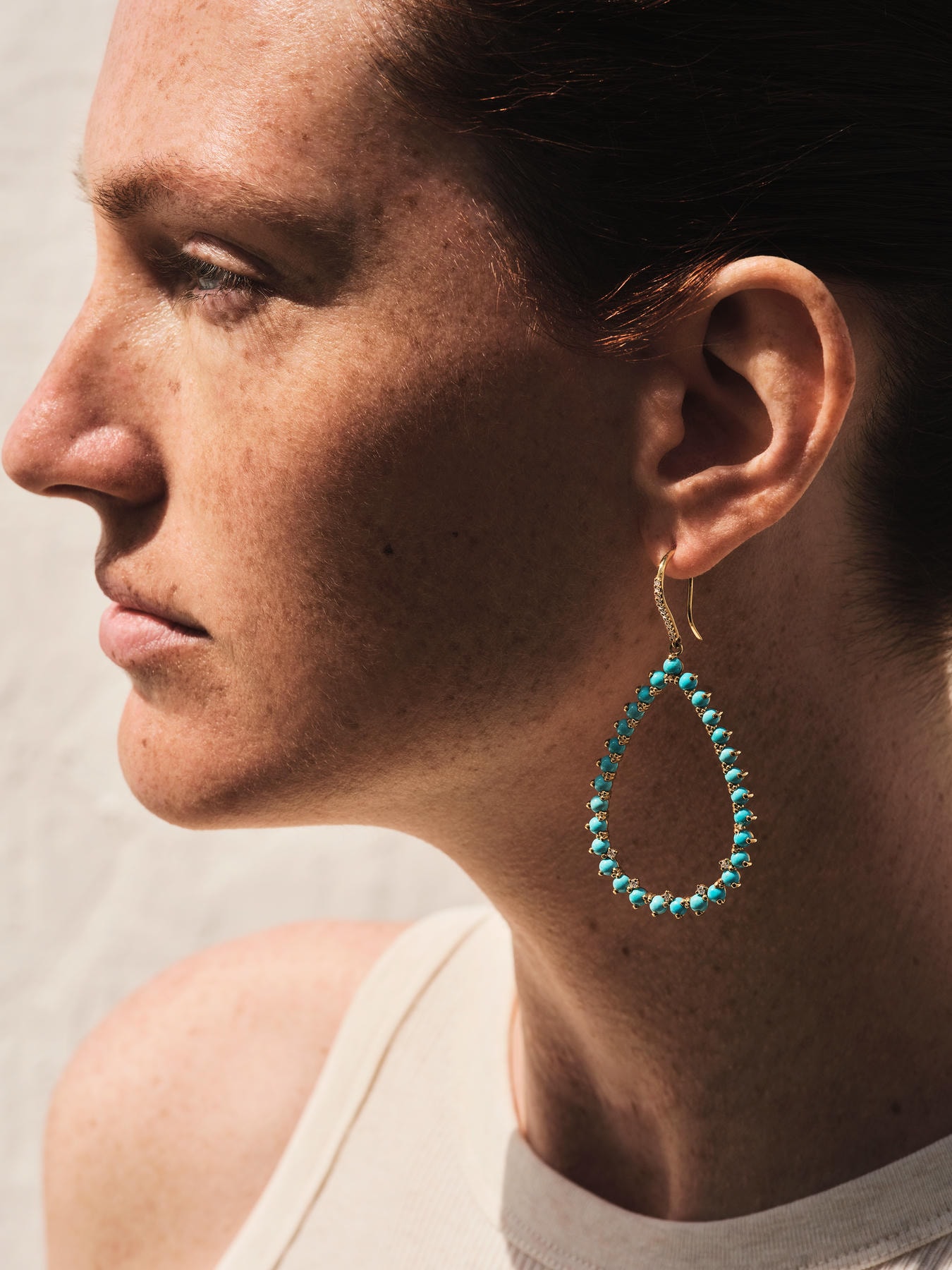 Across the pair, fifty-eight cabochons form a field of saturated blue—fresh, luminous, unmistakably feminine. A fine scatter of diamonds traces the inner curve of each drop, with additional stones set along the hooks; the effect is refined yet unforced.