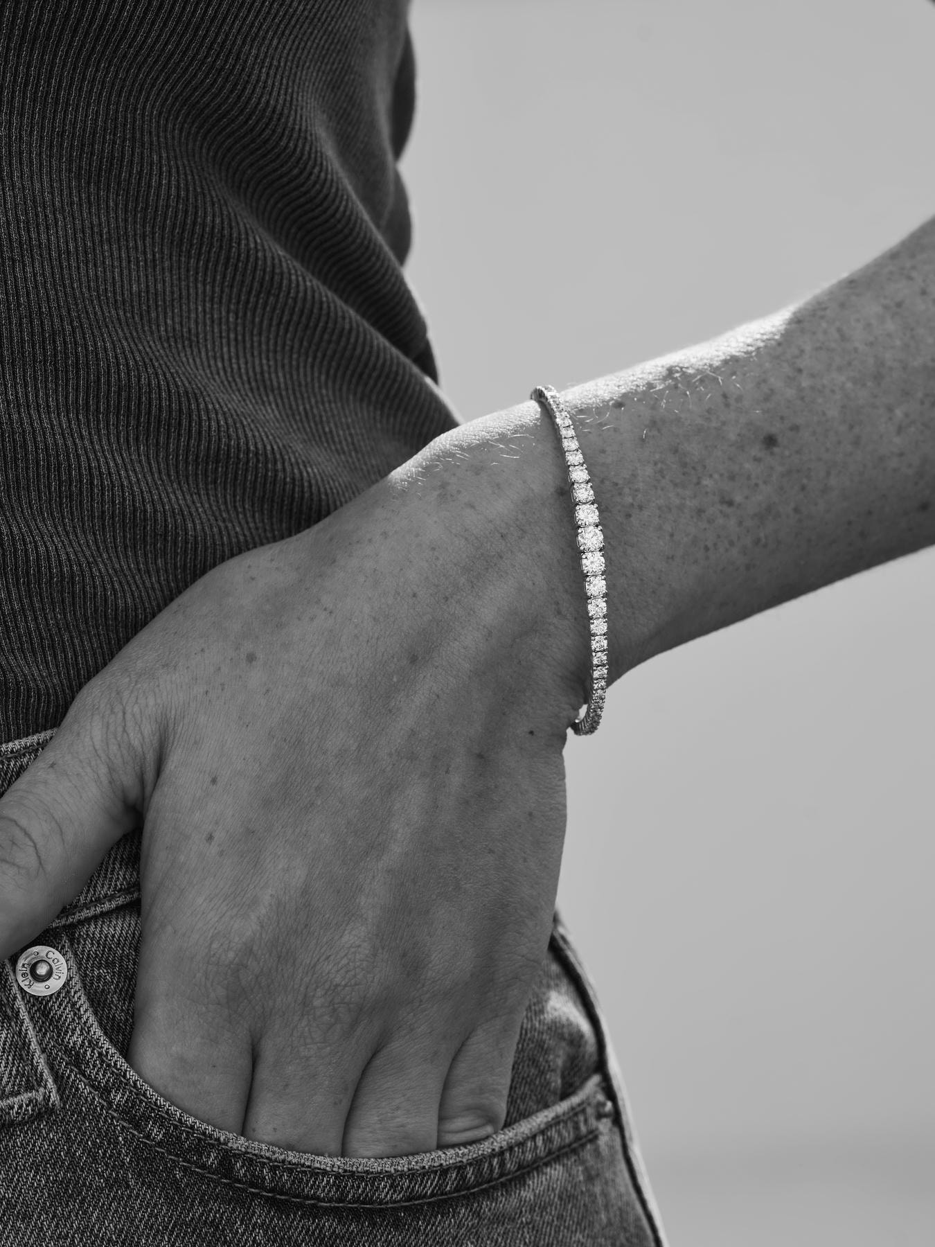 A modern take on the classic tennis bracelet, this bangle curves gently around the wrist—elegant, refined, and innately feminine. At its centre, a 0.40ct diamond anchors the form, subtly giving way to smaller stones in a graceful dégradé. The result is a flowing line of brilliance—timeless, luminous, and effortlessly magnetic.