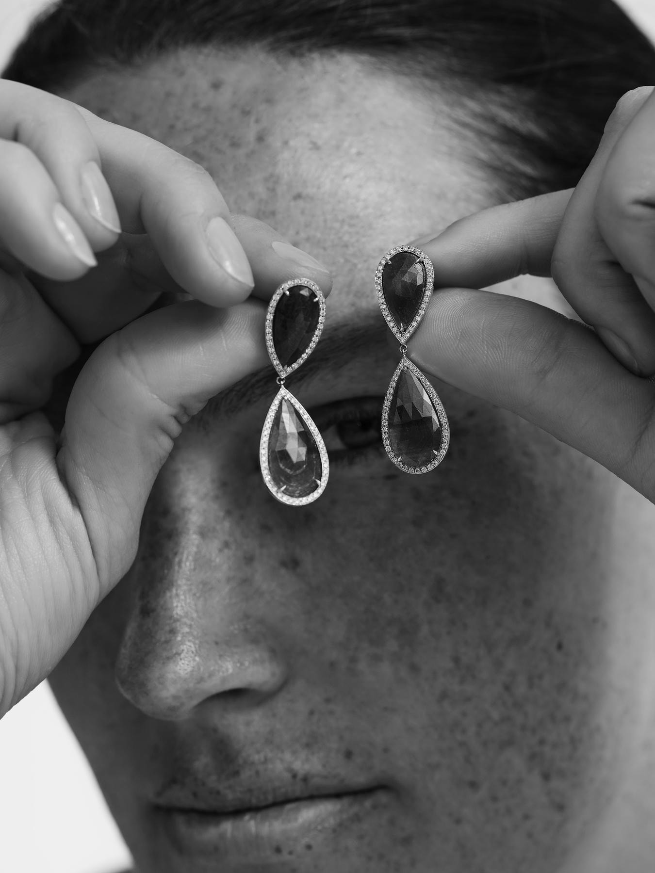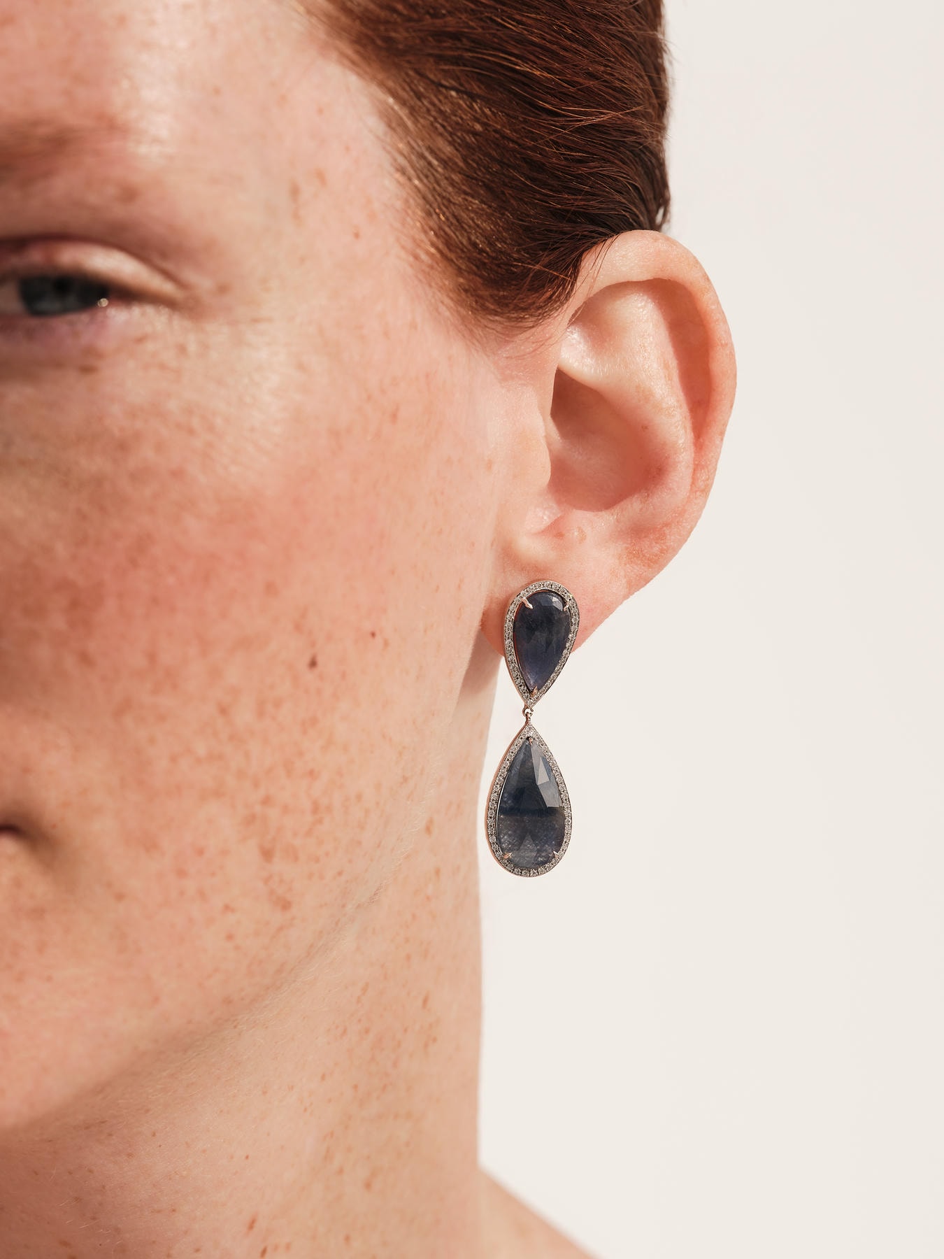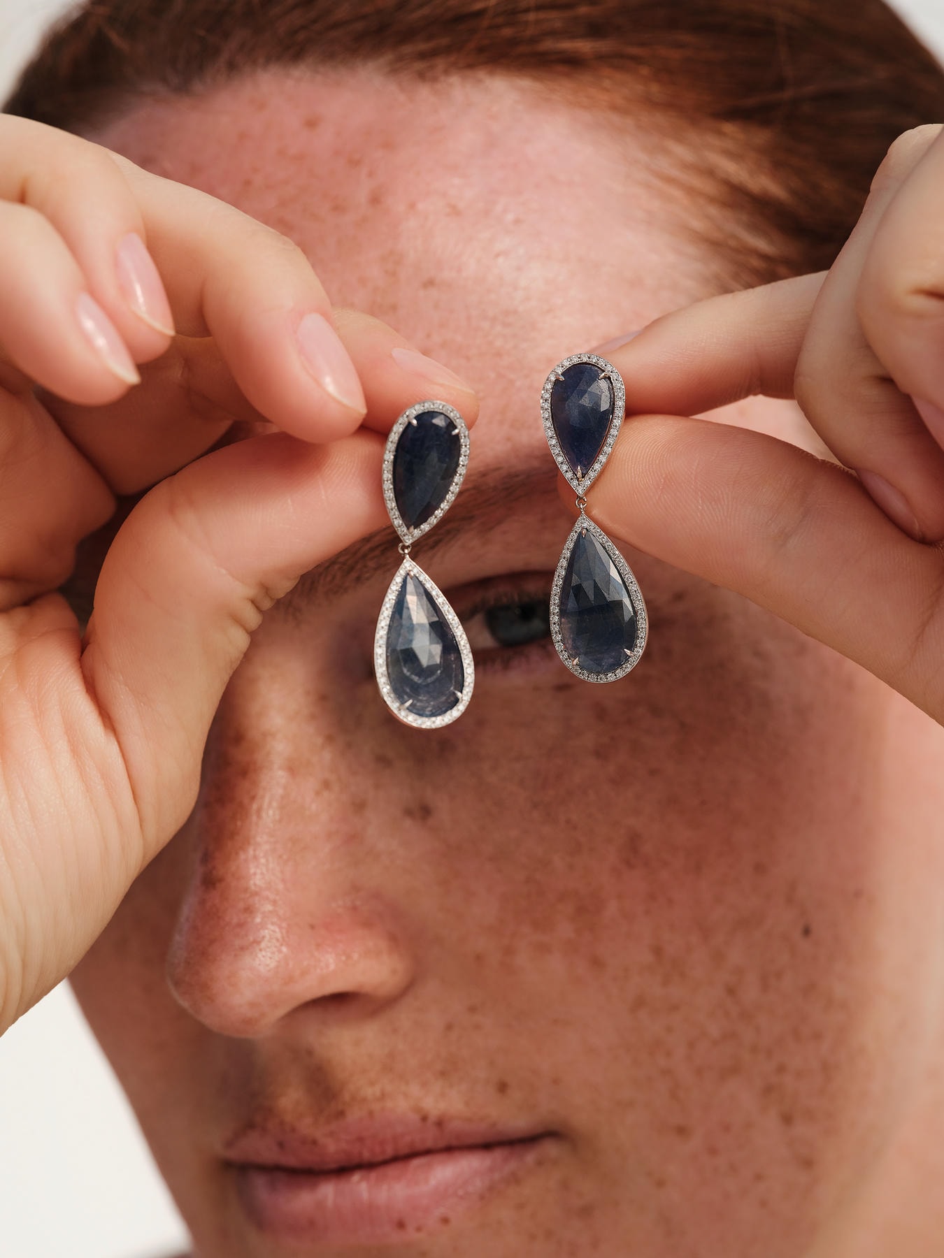 A double-pear silhouette pairs natural, untreated flat sapphires, each traced with pavé diamonds. A fine link between the stones gives articulate movement, while the flat cut keeps the scale generous and the wear effortless.