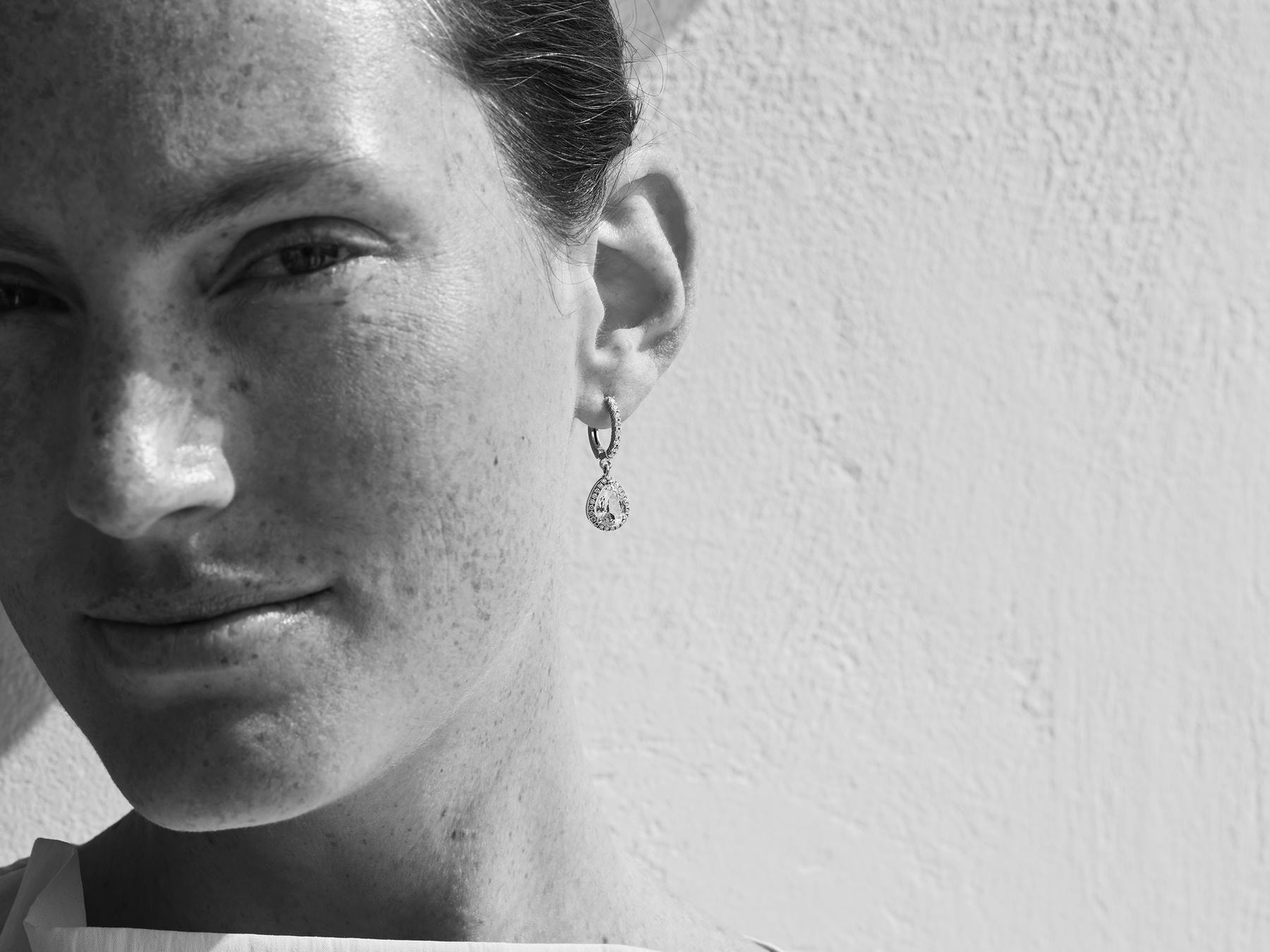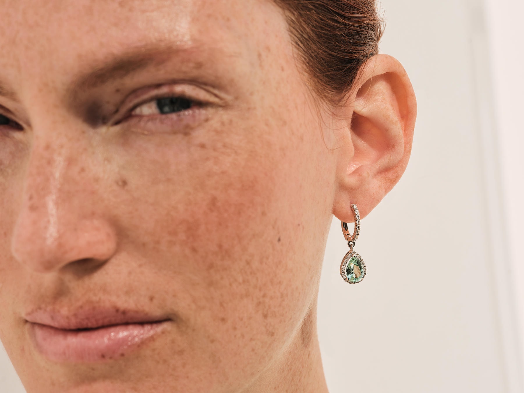 Setting: Halo-set drops suspended from pavé diamond hoops