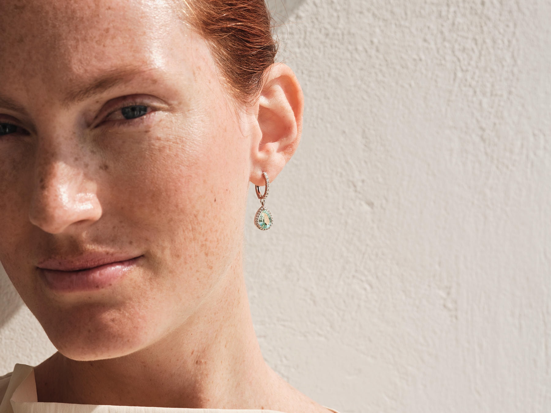 The silhouette is deliberately restrained: classical lines, precise proportions, an easy drop. The diamonds elevate rather than overwhelm, lending radiance that amplifies the stone’s natural glow.