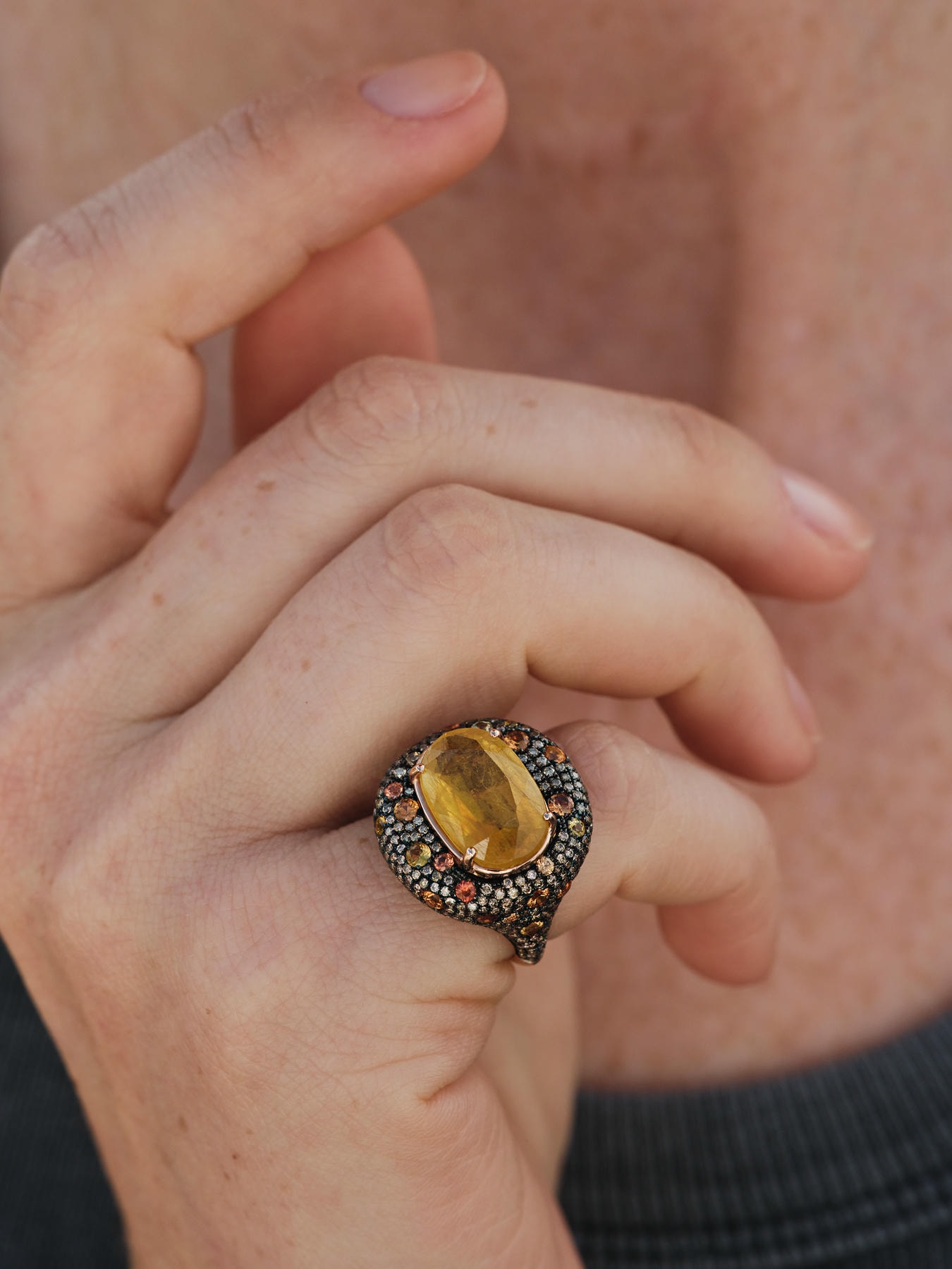 At its centre, a natural oval citrine is held by four golden prongs, glowing with depth and warmth. Surrounding it, a pavé of citrus sapphires and smoky diamonds spreads like molten light, set into black rhodium-plated gold to accentuate their vivid intensity.