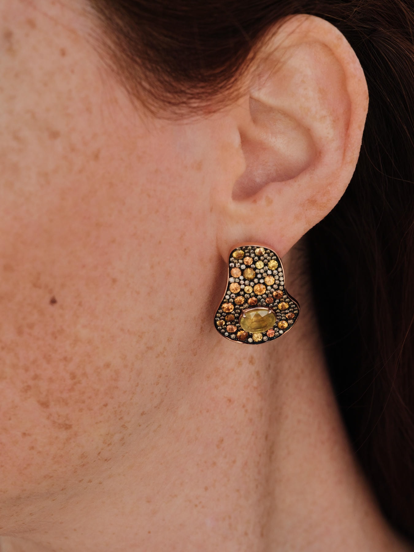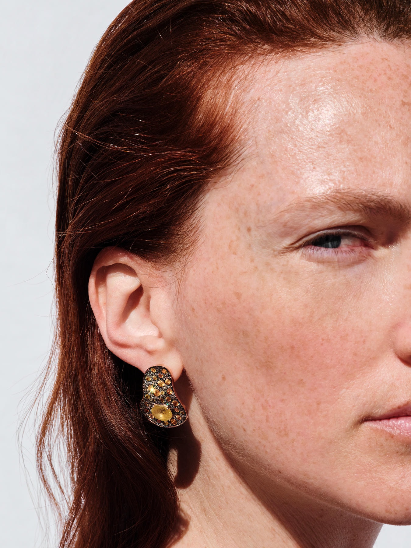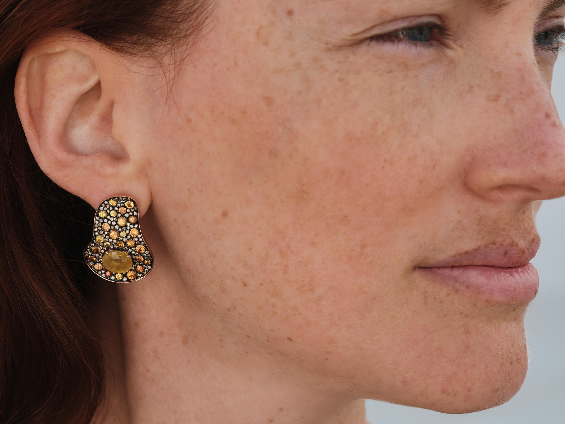 A pair of fluid silhouette earrings, where natural citrine meets citrus-toned sapphires in a vibrant composition. Accented by smoky diamonds and set in black rhodium-plated gold, each element radiates a kind of depth that feels both abstract and solid.