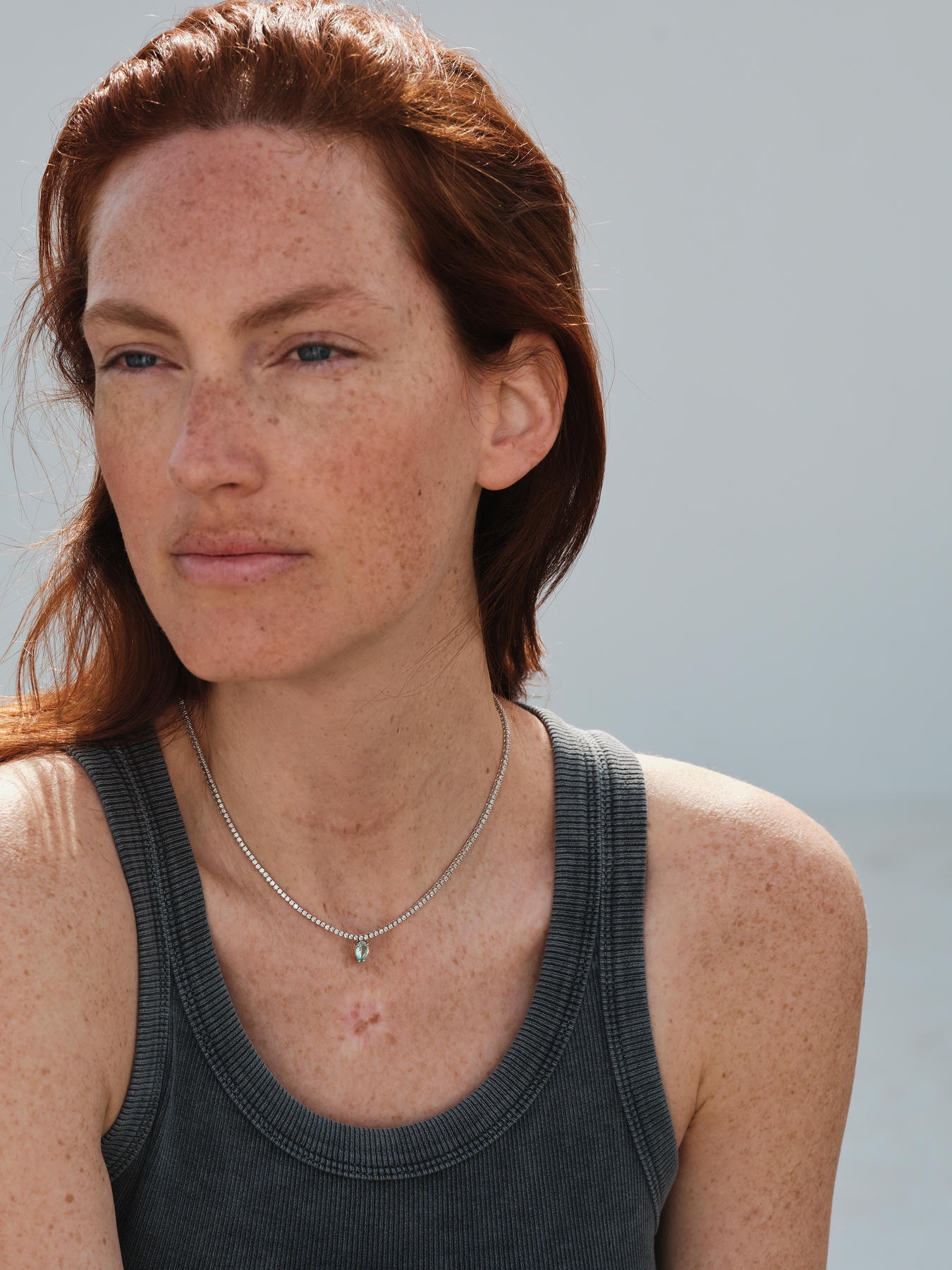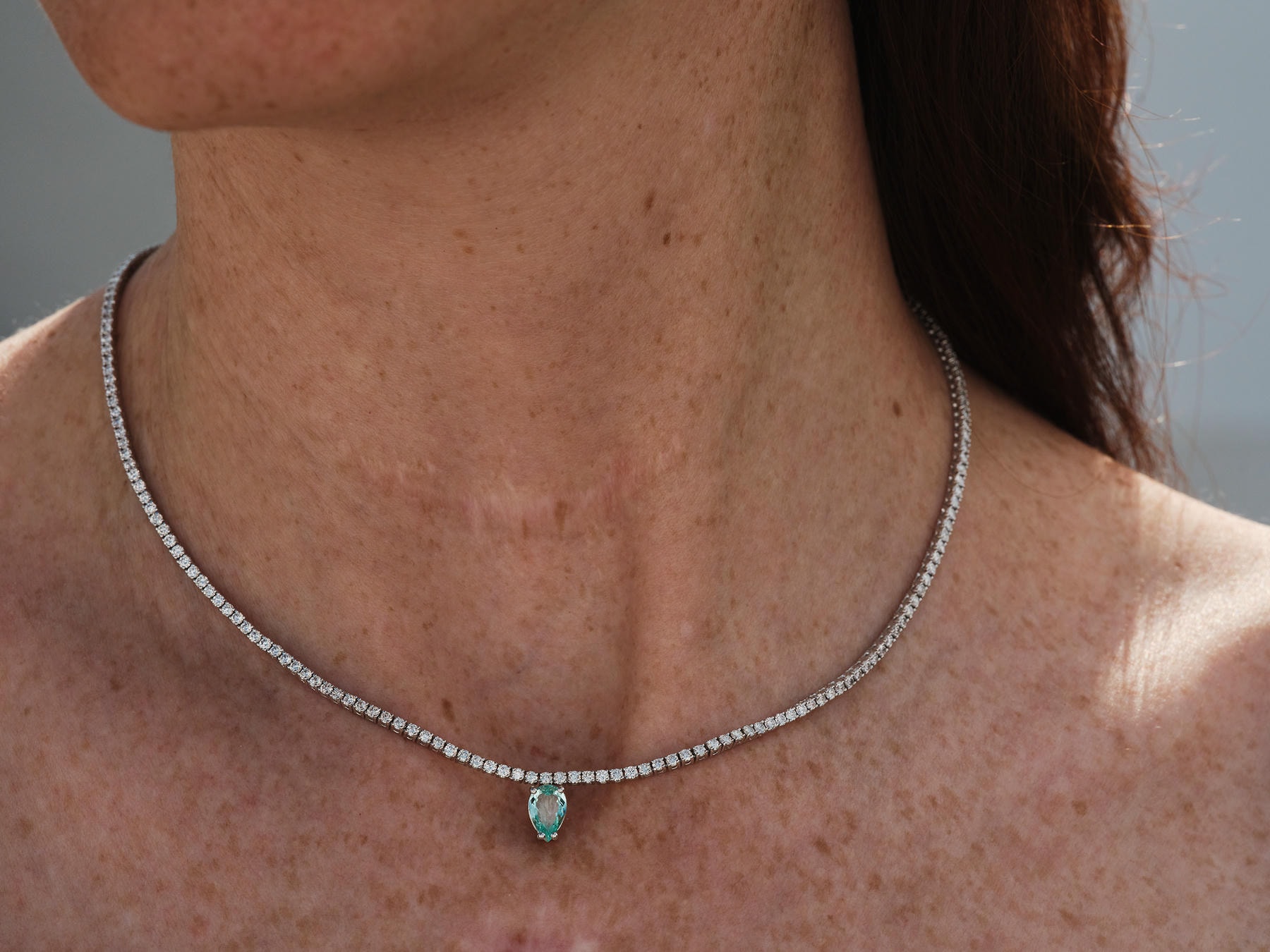 A precise line of brilliant-cut diamonds traces the collarbone like a calm current of light. At its nadir, a pear Paraíba tourmaline is set deliberately inverted—a single droplet returned to source—so the eye rests on its rare Ionian-cyan glow while the silhouette sharpens to a modern line.