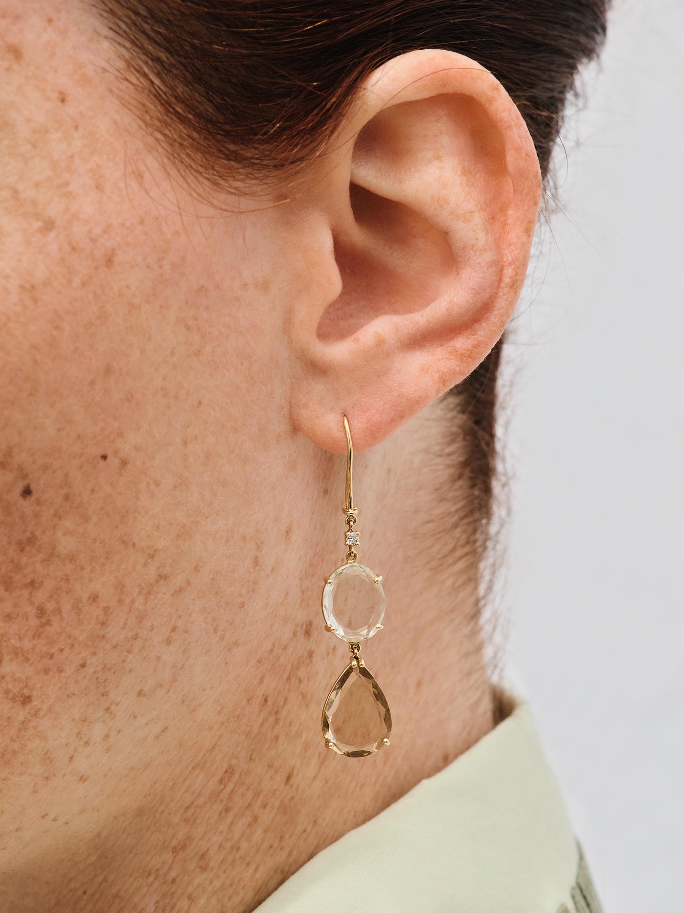 Lemon and smoky quartz drop earrings with a discreet diamond accent, articulated for movement and finished on a minimal yellow-gold hook.