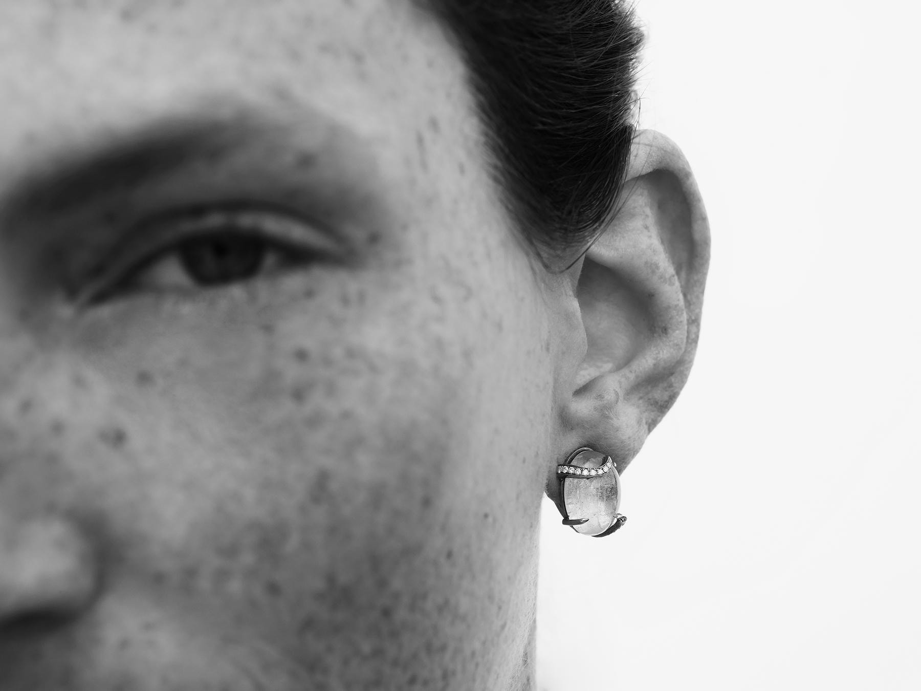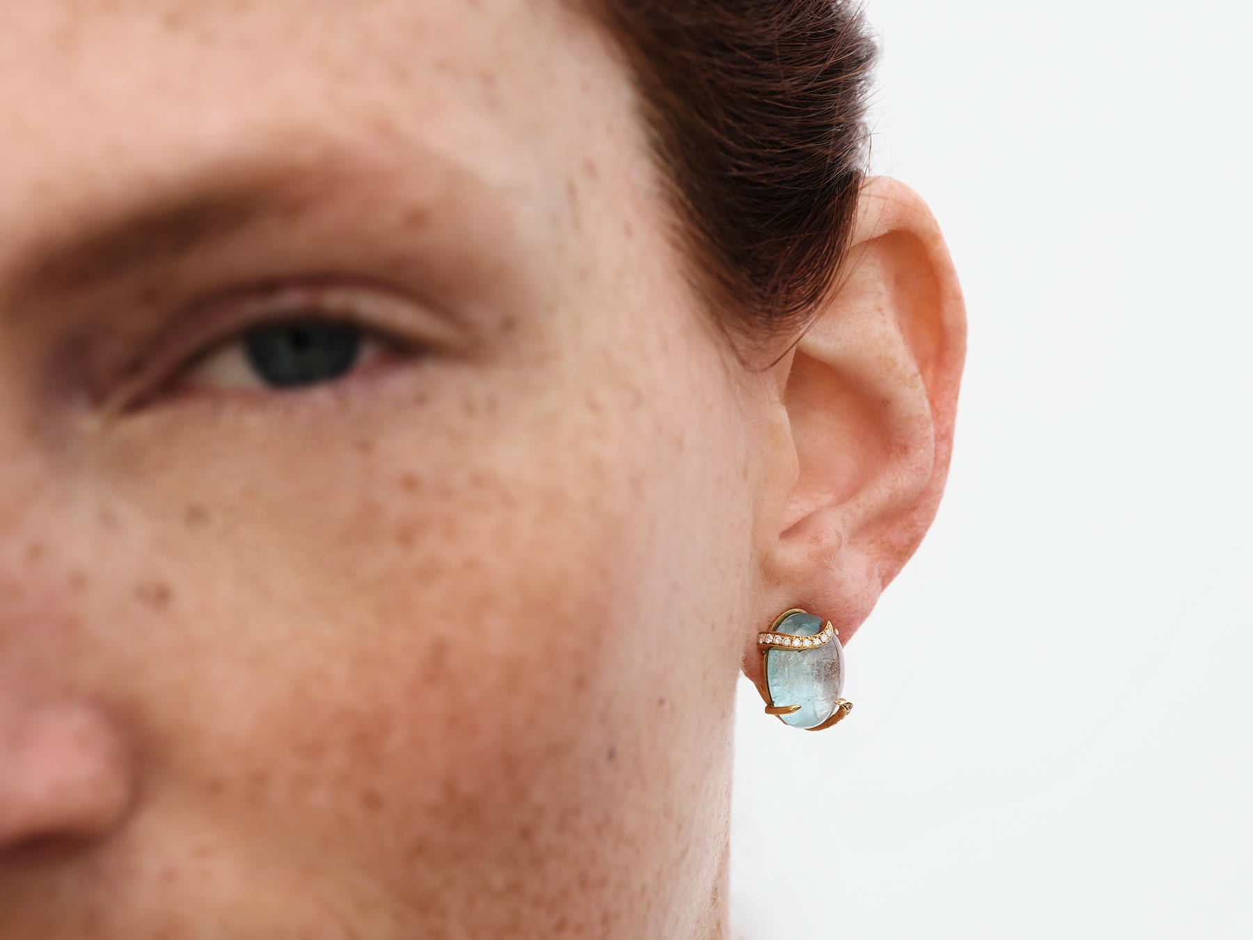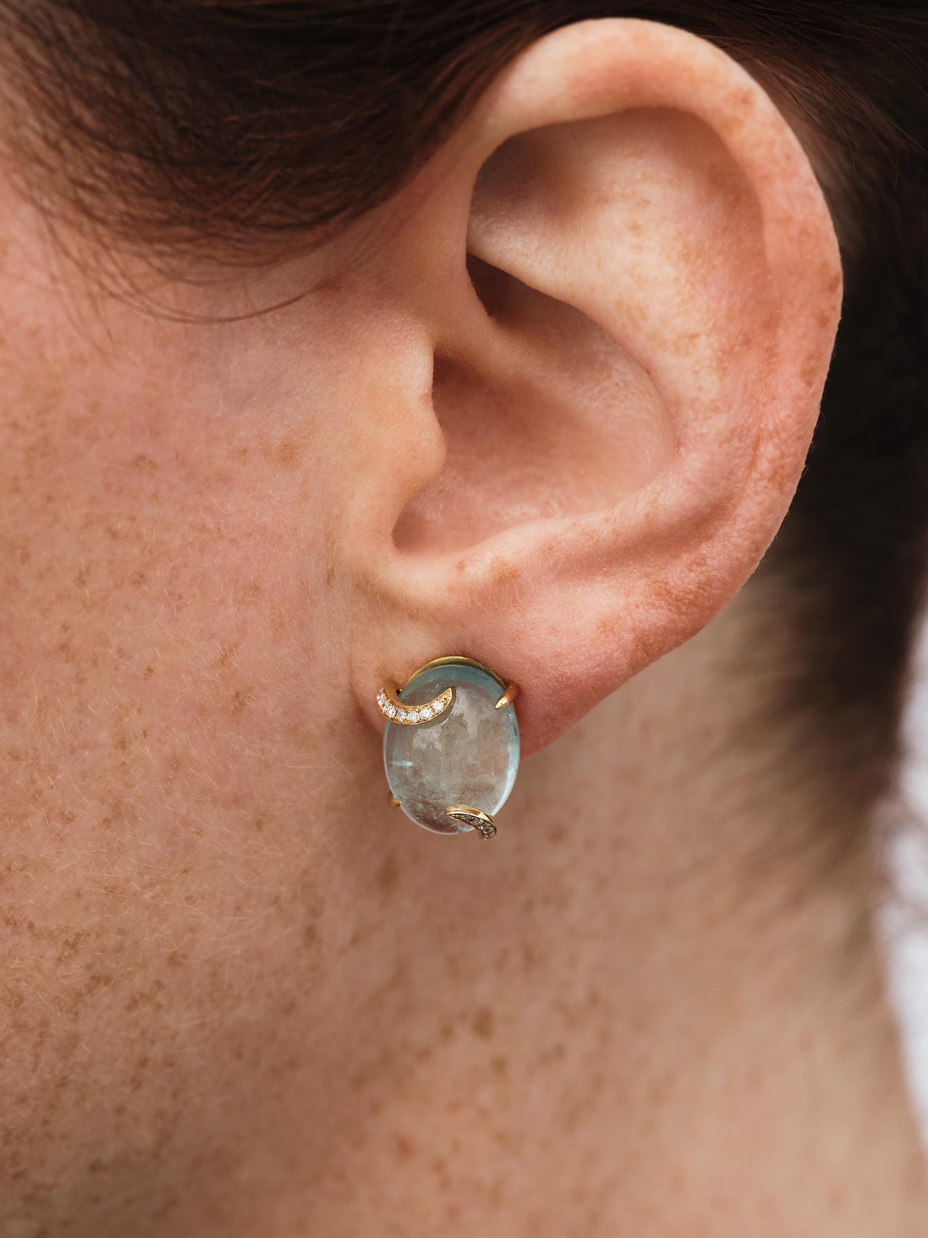 Onde is water held in form. Each stud centres an aquamarine cabochon, its surface softly rounded to catch and diffuse light. Two yellow-gold arcs, pavé-set with diamonds, sweep across the stone like twin waves—one rising, one receding—holding it in a gentle, protective embrace. The composition is sculptural and refined, sitting close to the lobe for an elegant profile and effortless wear.
