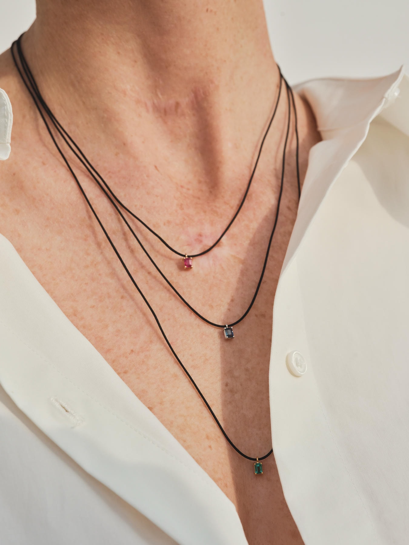 Fine emerald-cut precious stone (ruby, sapphire, or emerald) set in 18k gold and strung on a black cord. Minimal, genderless, effortless.