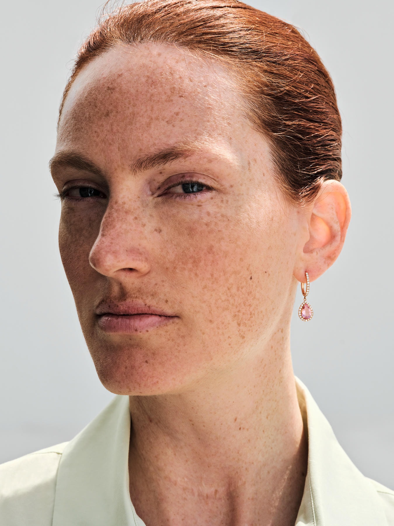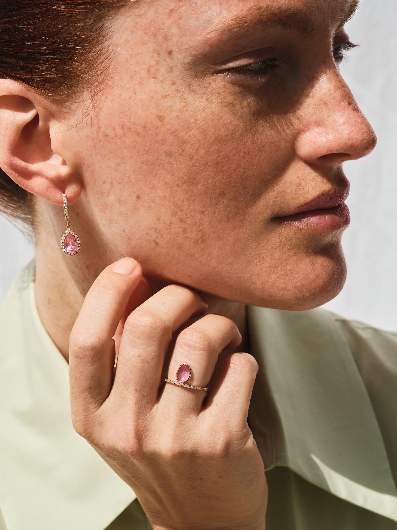 Every detail serves the colour: diamonds are set close to gather light and return it to the tourmalines, heightening their tender pink without overwhelming it. Considered proportions give presence without excess; the articulated drop catches light with each turn of the head, while 18k rose gold warms the complexion.