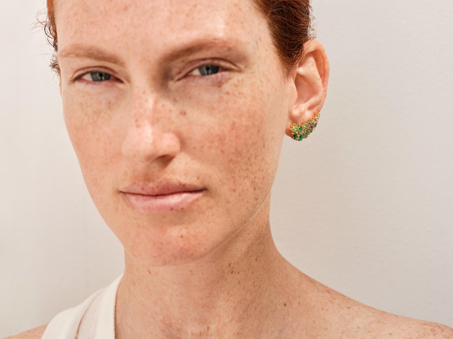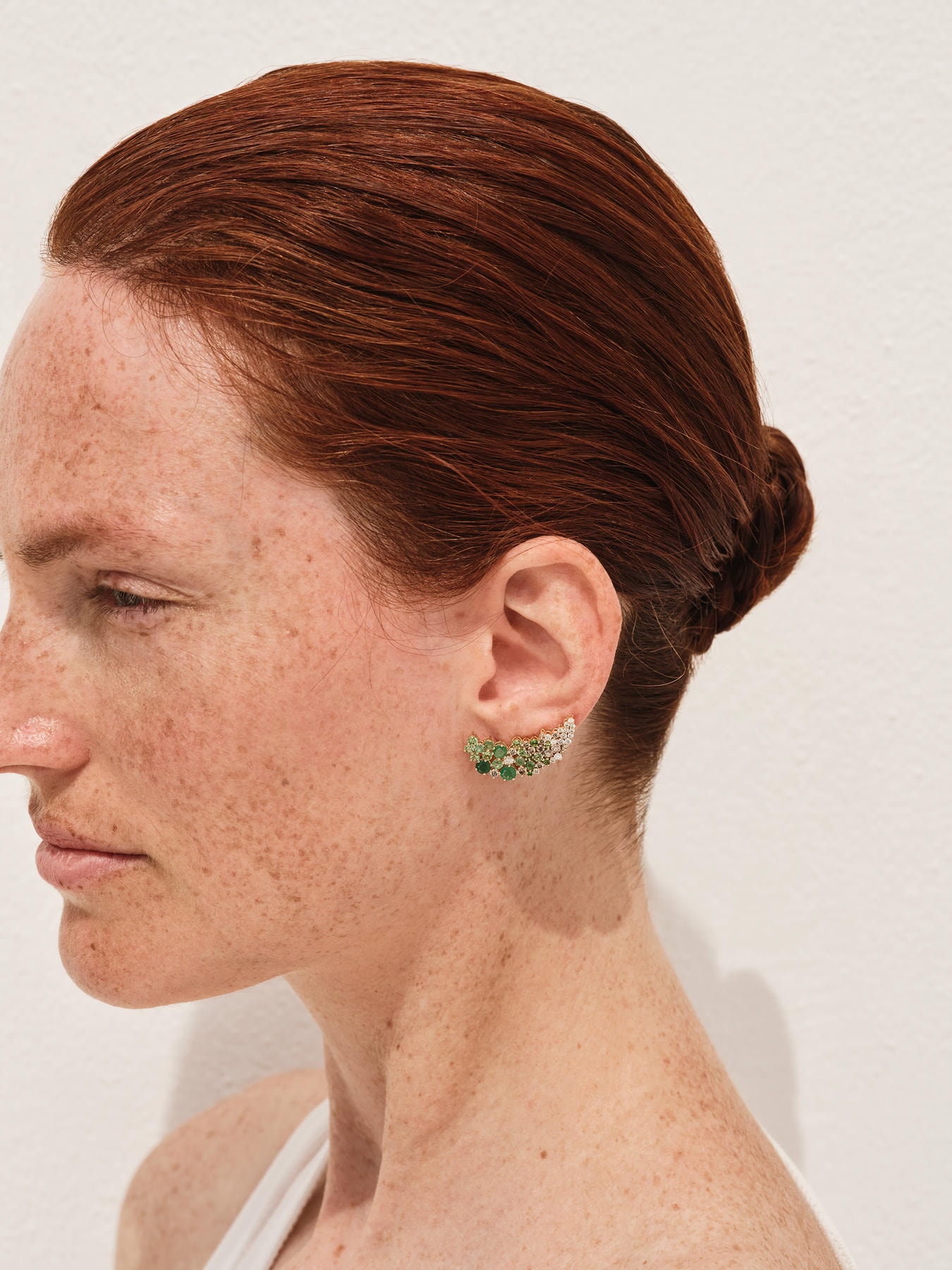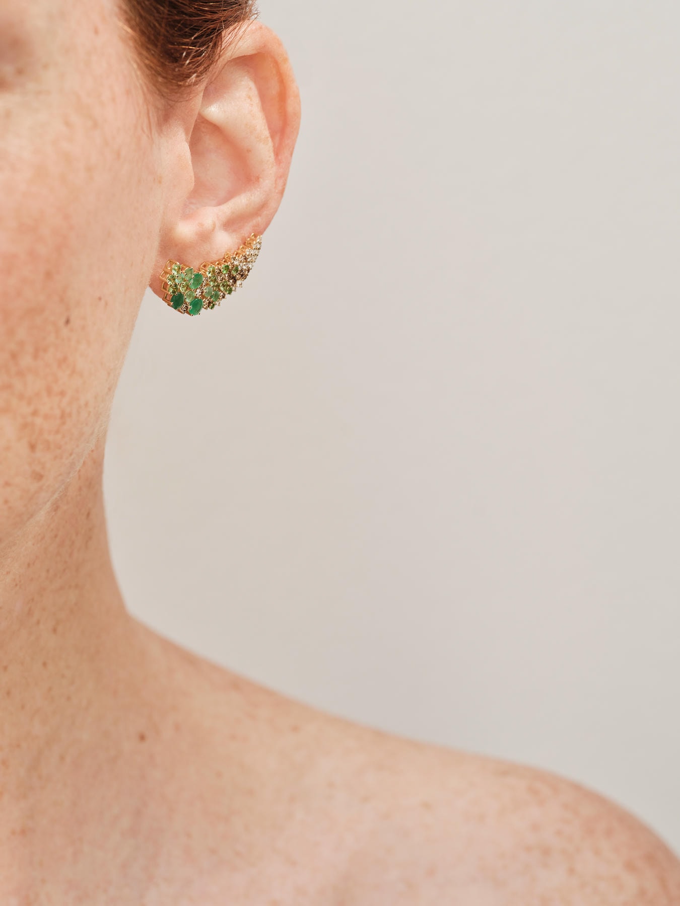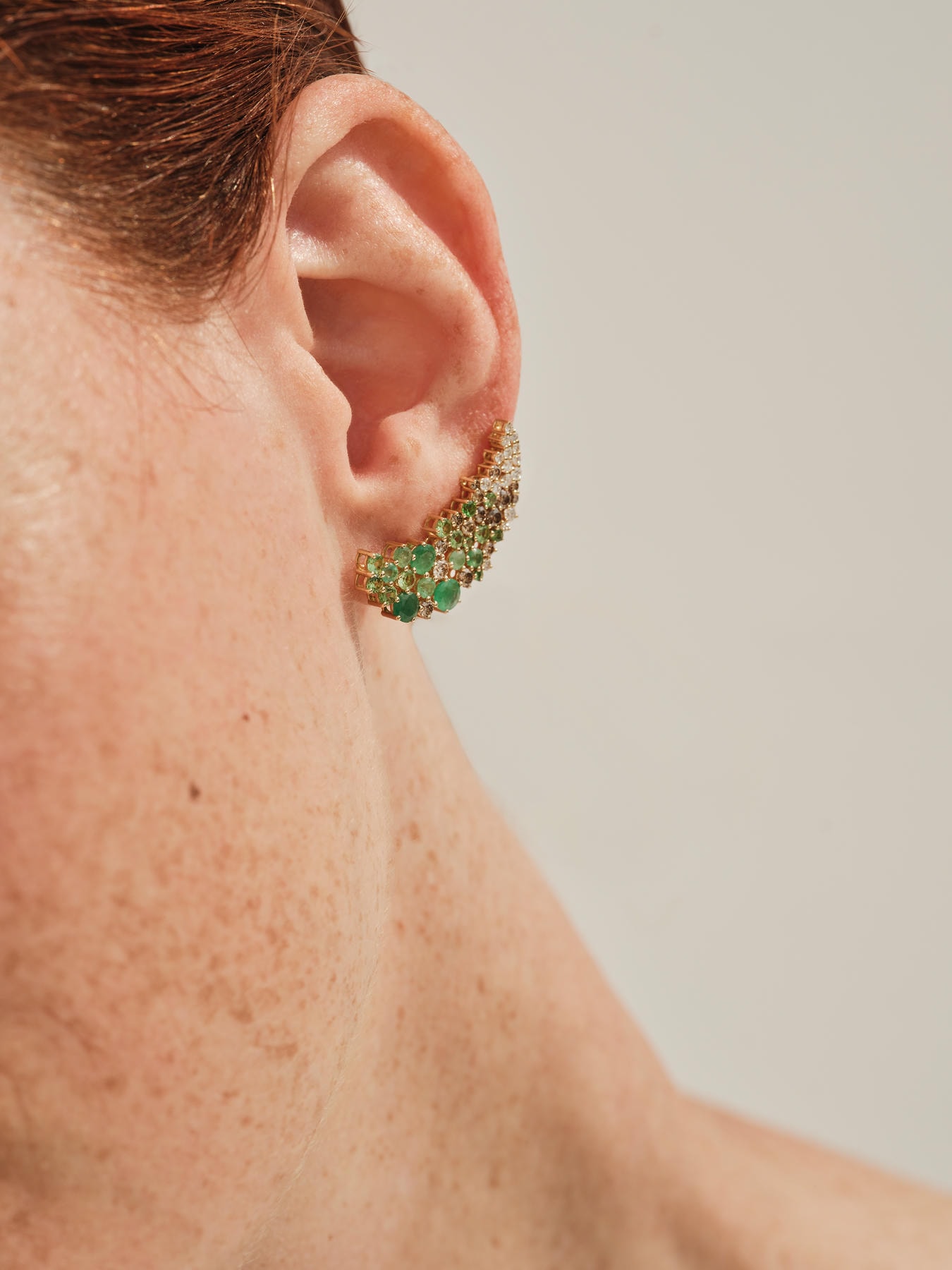 Ear cuffs featuring emeralds in gradient hues, tsavorites, white and smoky diamonds, set in yellow gold.