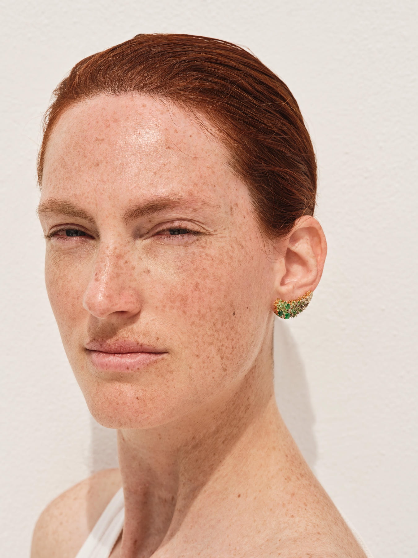 Set in yellow gold, a composition of emeralds in gradient hues blends seamlessly with tsavorites and diamonds in white and smoky tones. The intensity of colour slowly fades toward the top, like emotion itself—beginning vivid and untamed, then settling into clarity, strength, and quiet endurance.