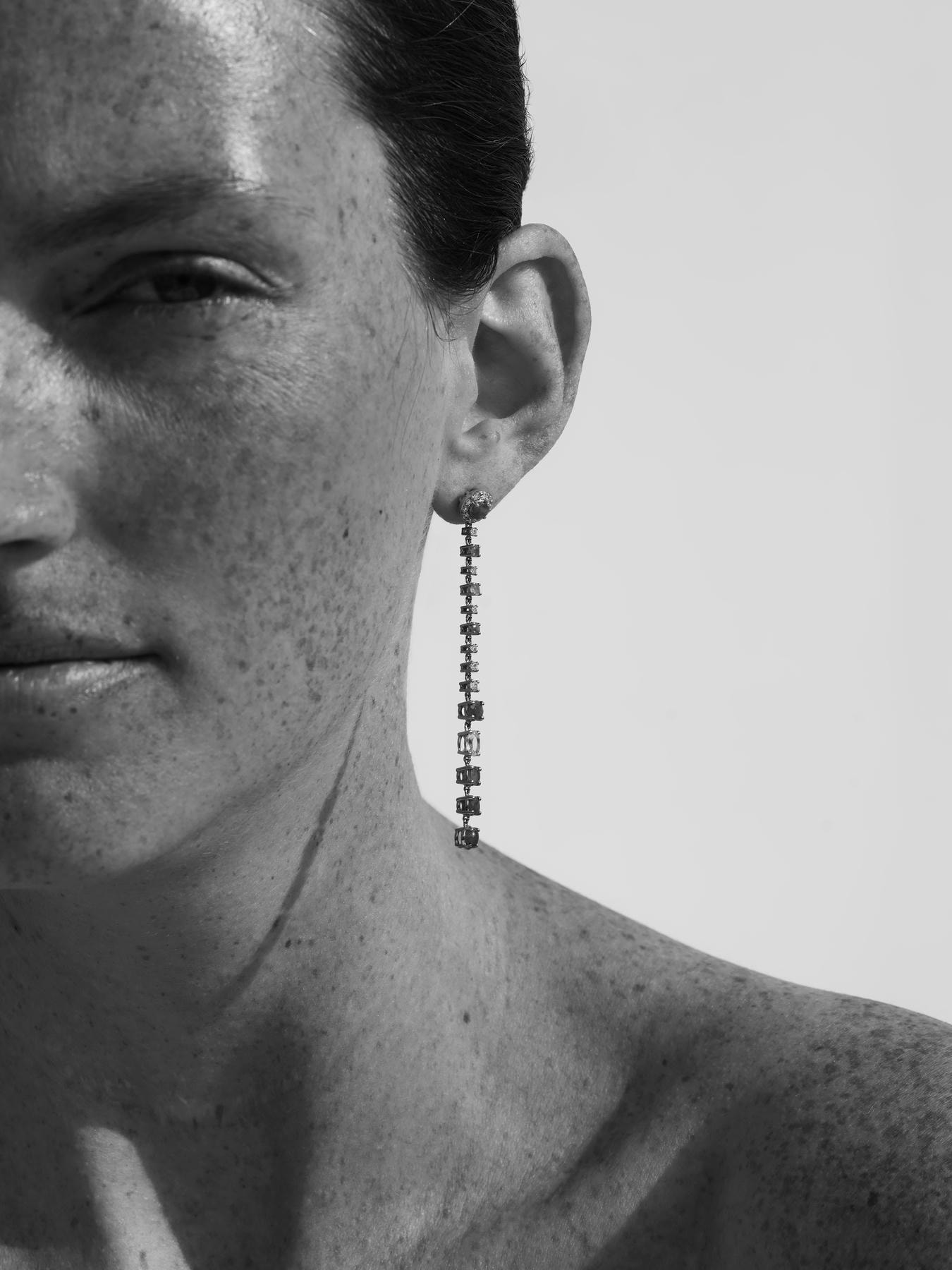 Set in yellow gold, the stones are individually linked, allowing the piece to move with the wearer—fluid, articulate, alive. Though long and sculptural, its linear form remains refined, tracing the neck with an elegance that feels both intentional and effortless.