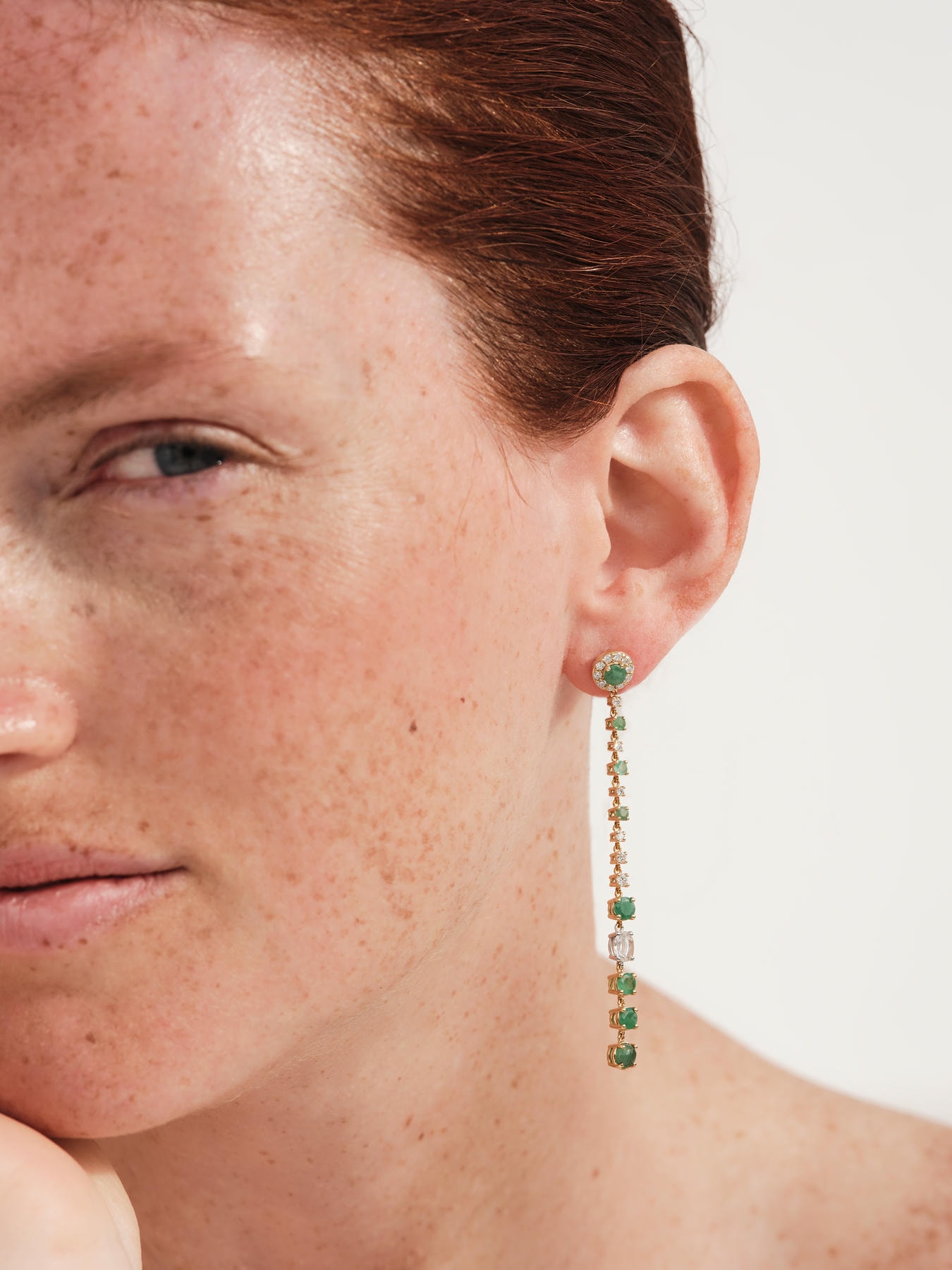 Earrings showcasing a composition of emeralds in varied cuts—cabochons, rounds, and faceted forms—paired with a white sapphire on each piece and diamond accents. Set in yellow gold.